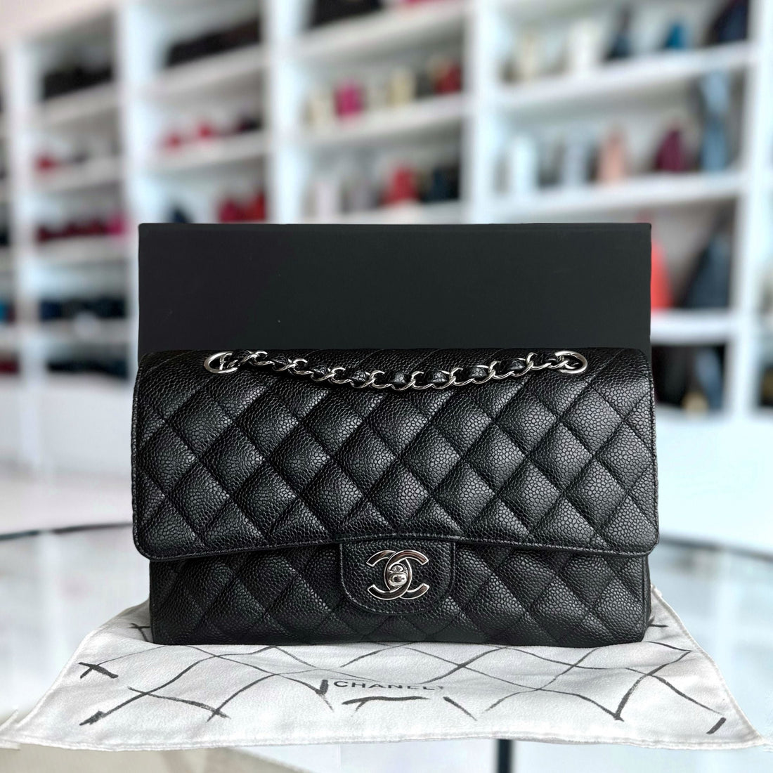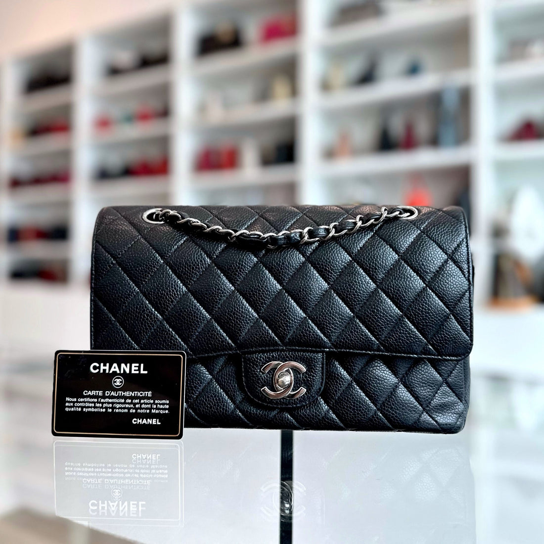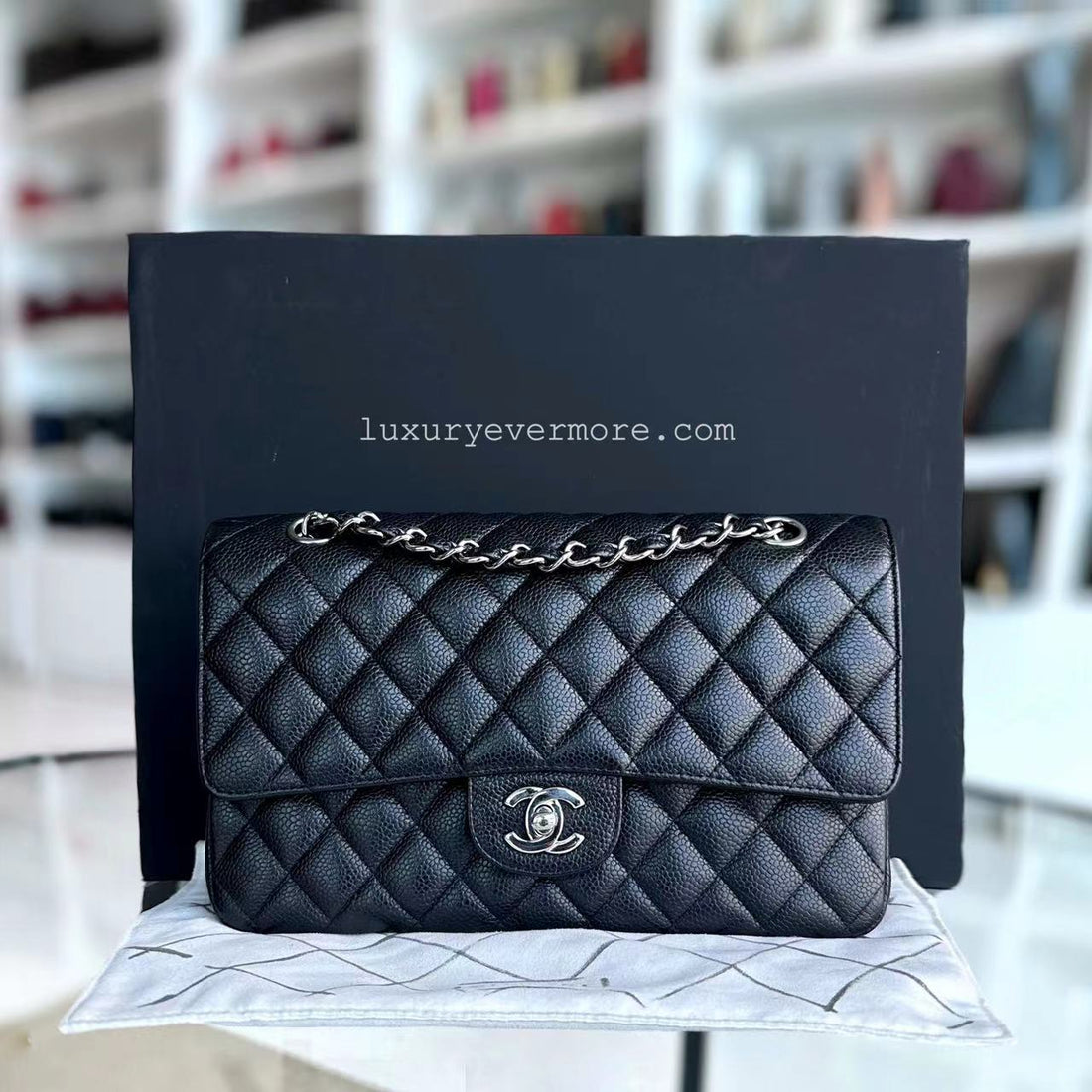 Caviar Double Flap Quilted Calfskin Black Silver Hardware Series 14