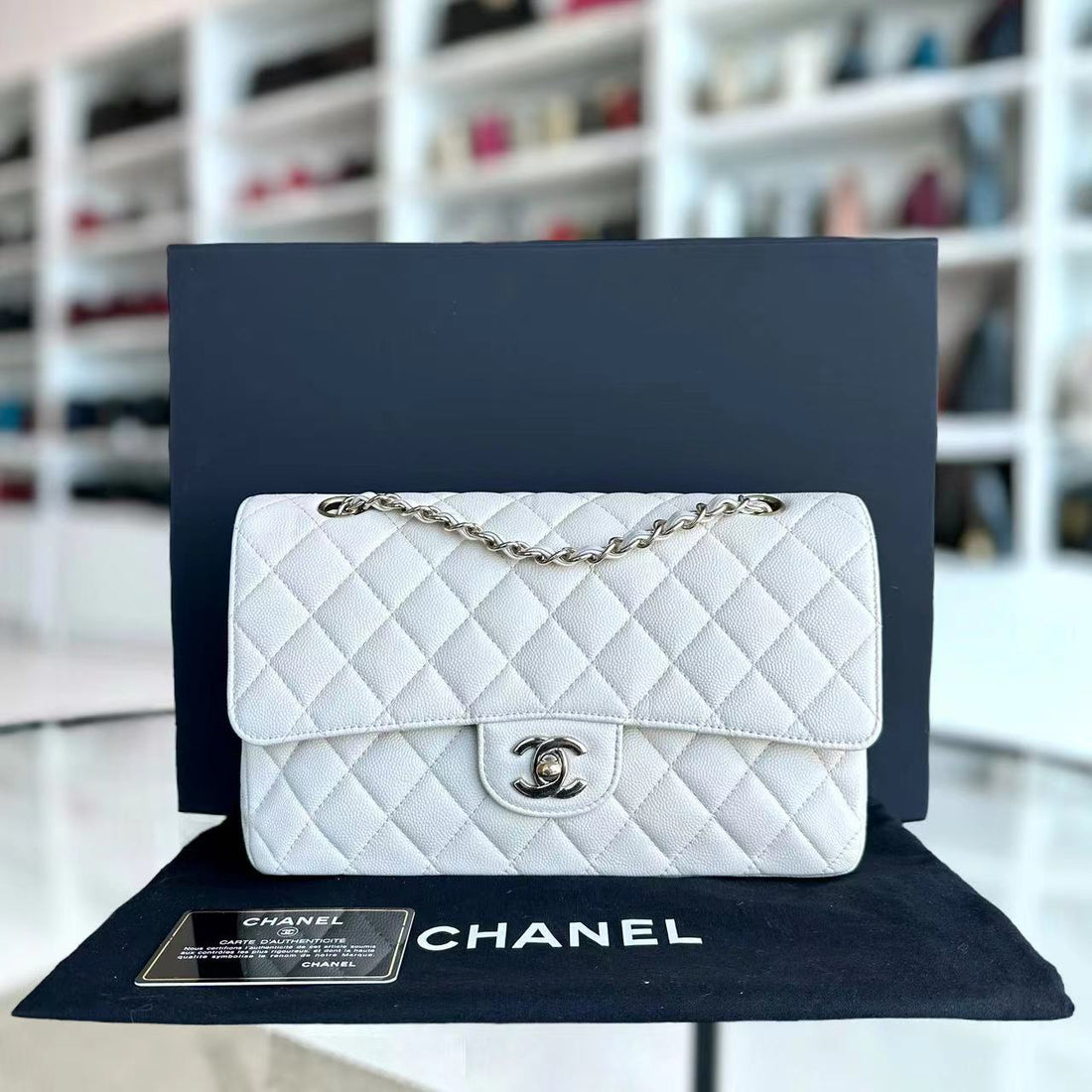 Caviar Double Flap 25CM Quilted Calfskin White SHW No 12