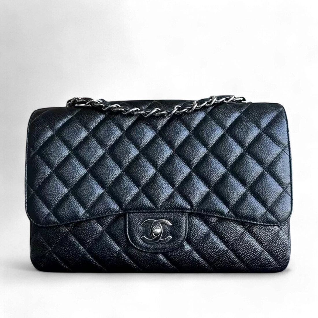 Caviar Jumbo Classic Flap Quilted Grained Calfskin Black Silver Hardware Series 12