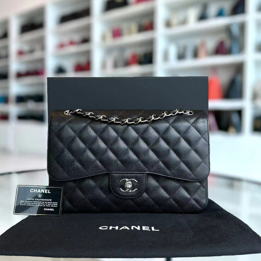 Caviar Jumbo Double Flap Classic Flap Quilted Calfskin Black Silver Hardware Series 19