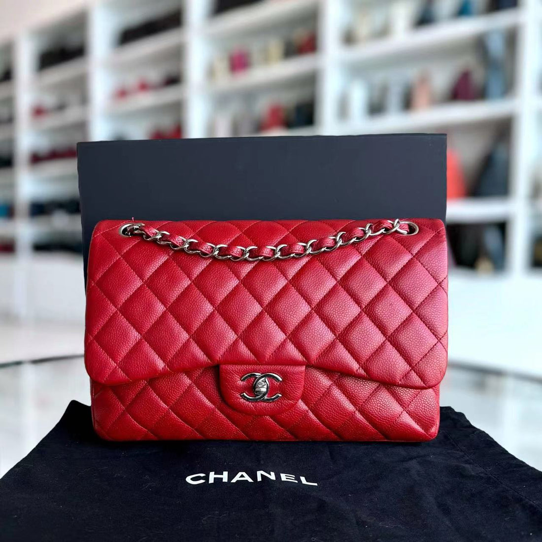 Caviar Jumbo Double Flap Classic Flap Quilted Calfskin Red SHW No 19