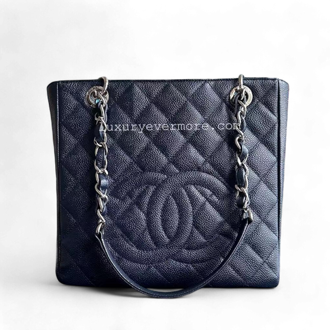 PST Petite Shopping Tote Caviar Quilted Dark Blue Silver Hardware Series 18