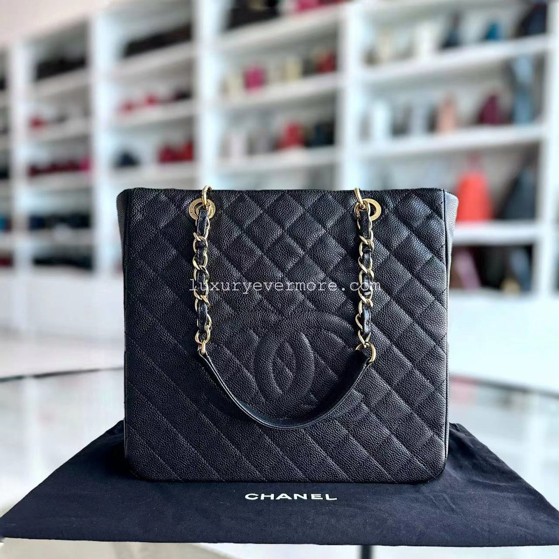 Caviar PST Petite Shopping Tote Quilted Grained Calfskin Black Golden Hardware Series 14