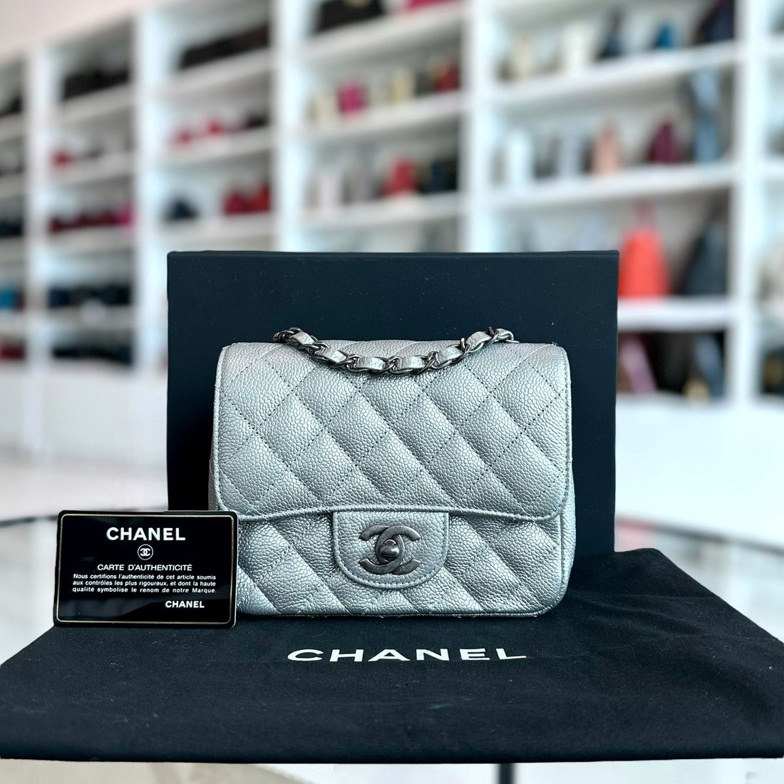 Caviar Mini Square Quilted Grained Calfskin Silver RSHW No 24