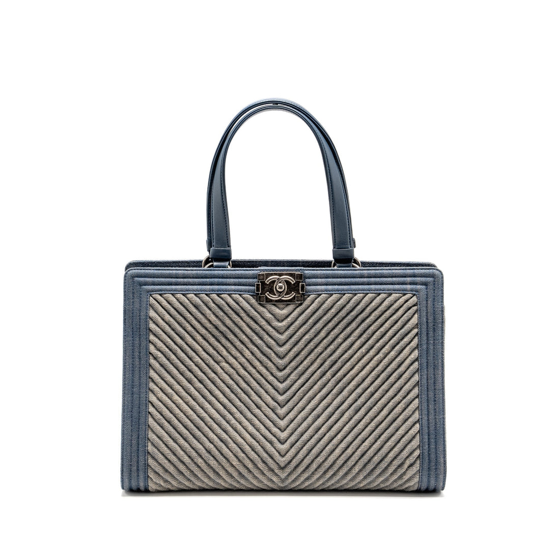 Chanel 15P Boy Chevron Shopping Tote Bag Denim/ Lambskin Blue Ruthenium Hardware
