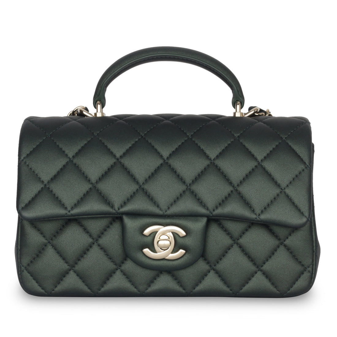 The mini rectangular flap bag from 2022 is an absolute vision. Crafted from metallic dark green lambskin...