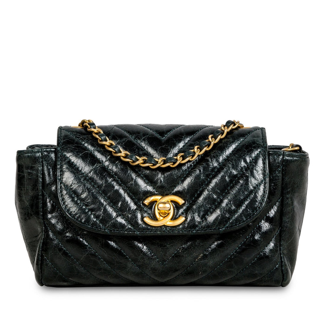 This Chanel mini flap bag features green Swarovski crystals, a front flap with signature CC...