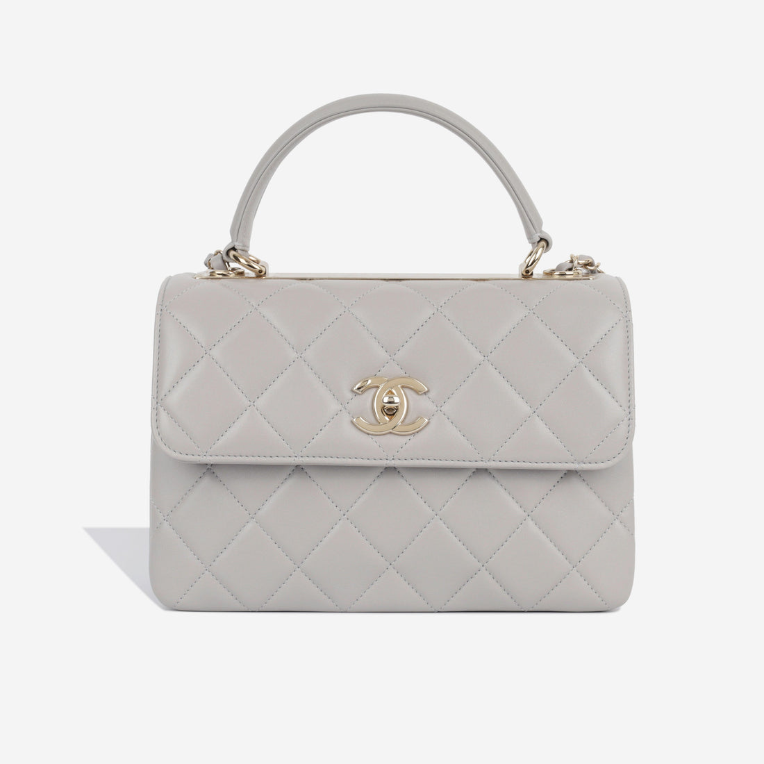 This Wallet on Chain is of Grey caviar with light gold tone hardware and has a front...