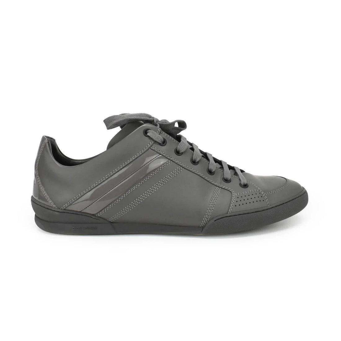 Dior low-top sneakers in dark grey smooth leather with patent leather detailing. Features embossed logo...