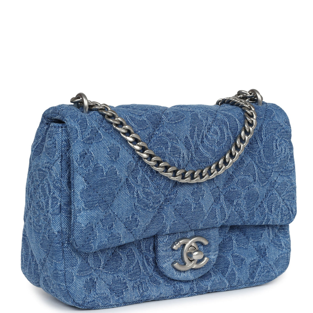 Chanel Mini Camellia Crush Rectangular Flap Blue Denim Antique Silver Hardware