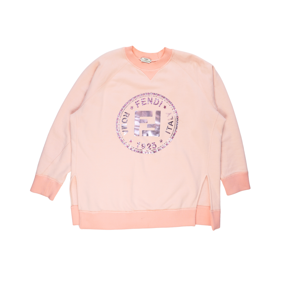 Fendi oversized crewneck sweatshirt in light pink cotton with a large metallic purple logo graphic...