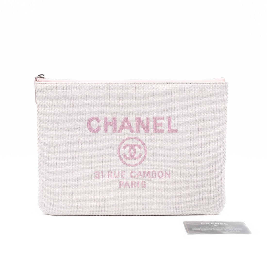 This stunning Chanel Large Deauville Pouch is a stylish accessory, crafted from light pink raffia, featuring...