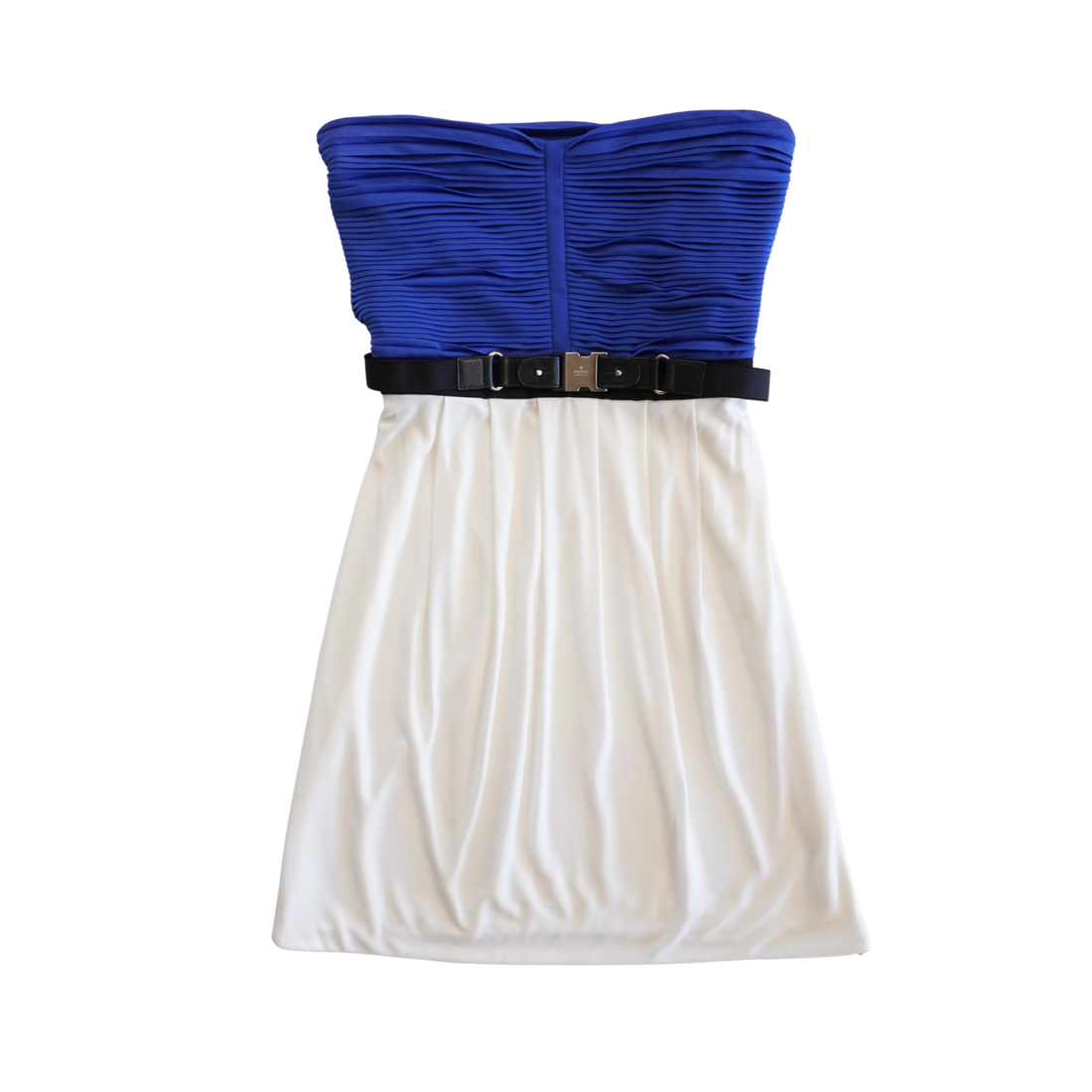 Gucci strapless mini dress with royal blue pleated bodice and white bubble skirt. Features a...