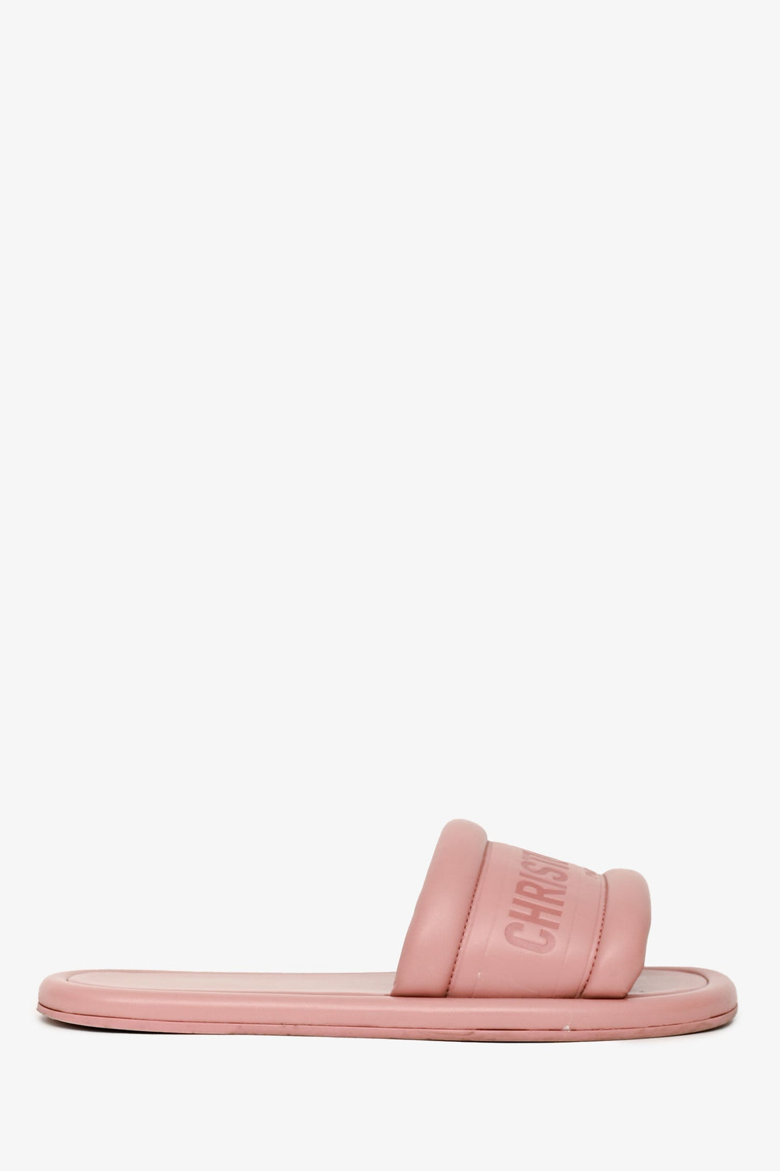 Christian Dior Pink Leather Every-D Logo Embossed Slides. Slip-on. Puffed toe strap. Leather insoles. Tonal...
