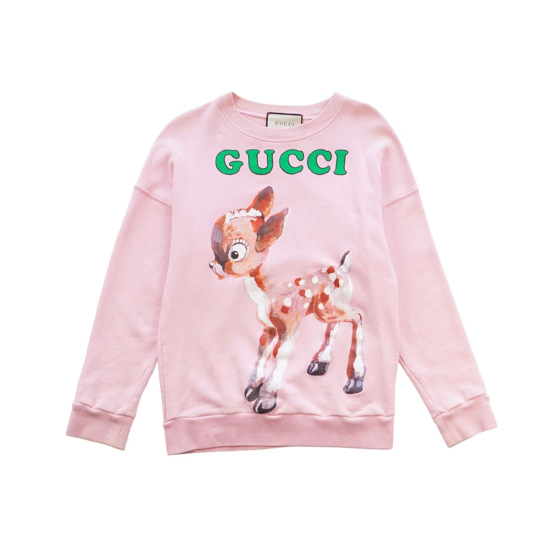 Gucci 'Bambi' crewneck sweater in pink cotton with a green logo and 'Bambi' printed graphic...