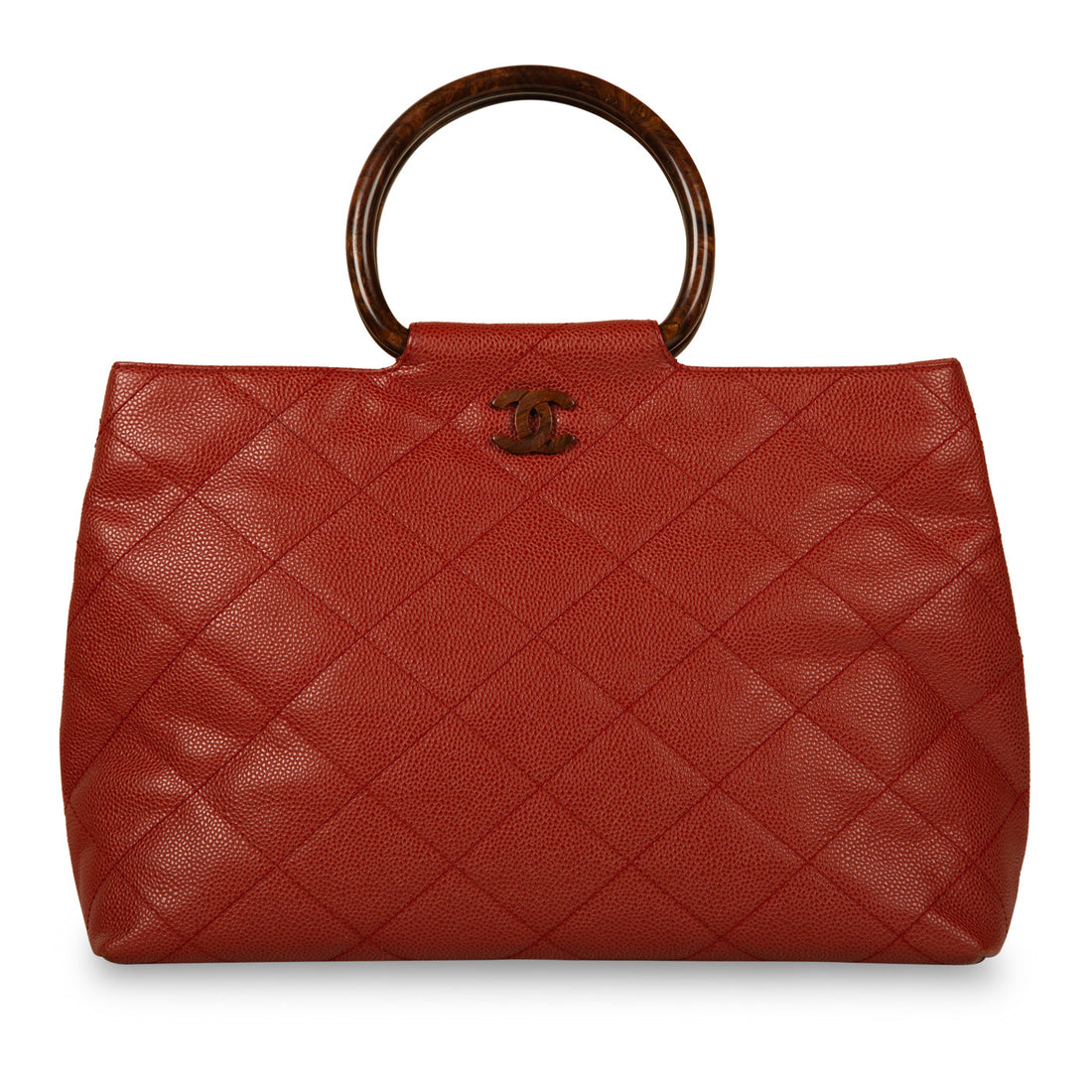 Crafted from red quilted caviar leather and round tortoise shell top handles, this vintage Chanel...