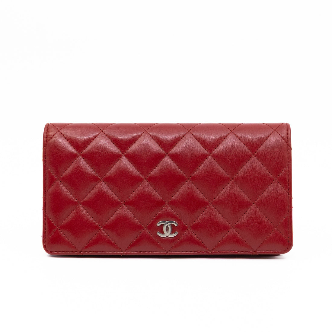 This is a Chanel classic long wallet. Made with red lambskin leather and matching leather...