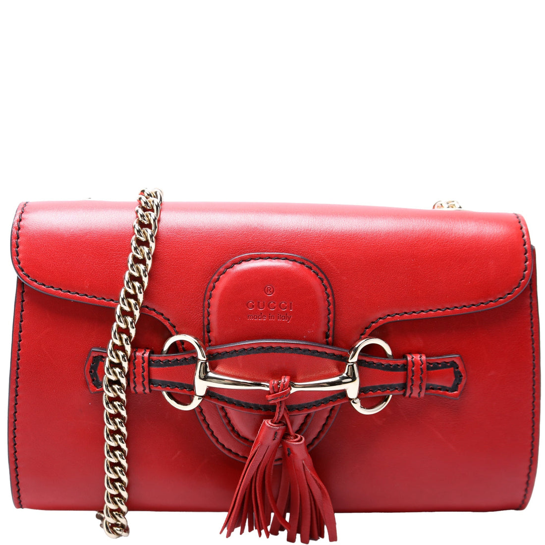 This Gucci Emily Mini Chainis eye catching bag. The exterior is in the classic Gucci calfskin...