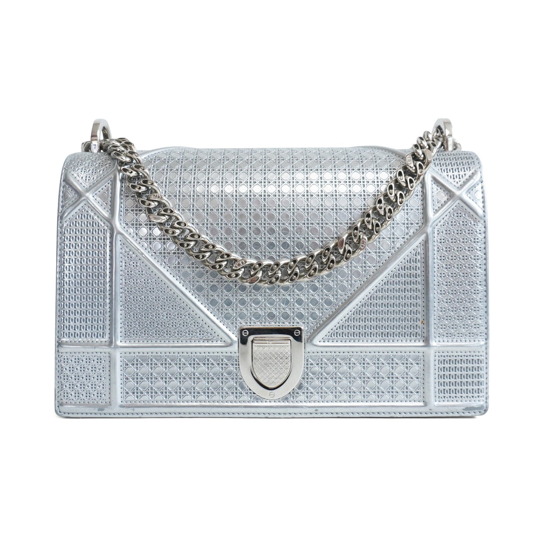 Christian Dior 'Medium Diorama' shoulder bag in micro cannage embossed metallic silver leather with silver...