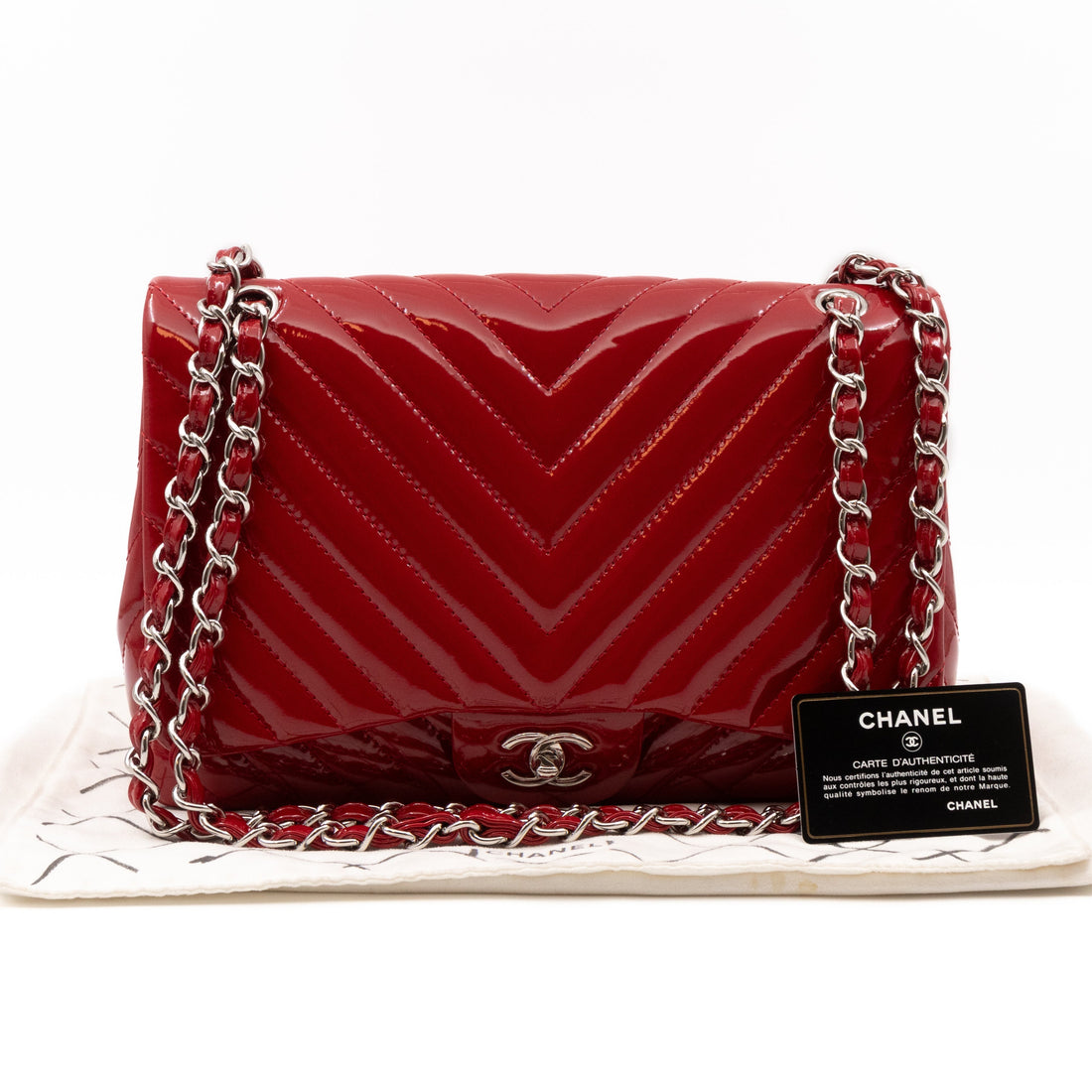 Classic Single Flap Jumbo Red Chevron Patent Silver