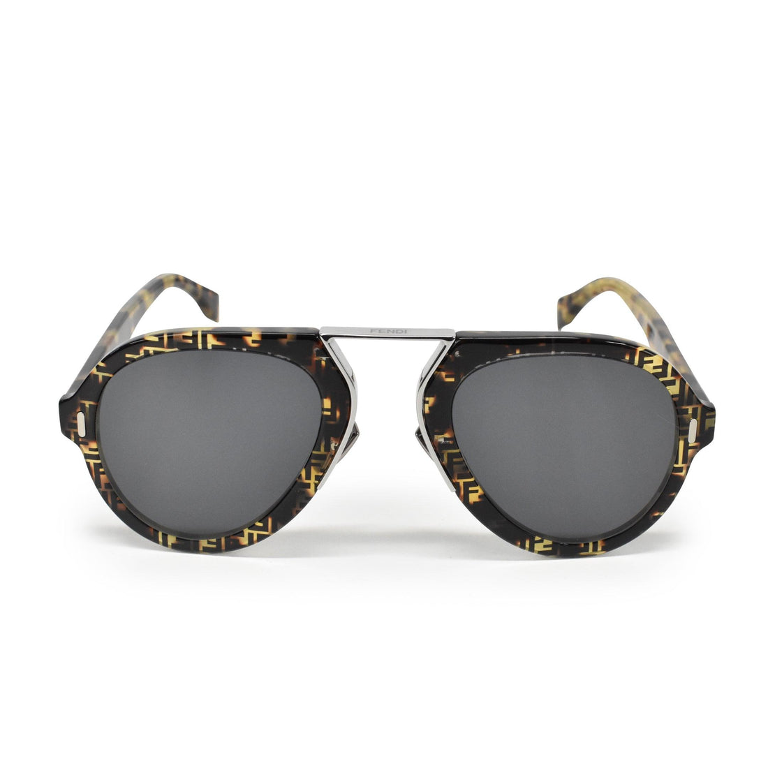 Fendi square aviator sunglasses in tortoiseshell acetate with black monogram Zucca print and silver hardware....