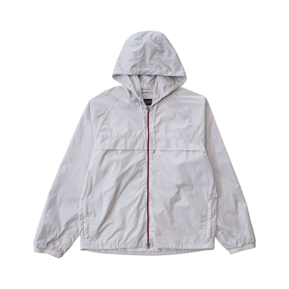 Gucci windbreaker jacket in light grey nylon with red, blue, and white racing stripe zipper....