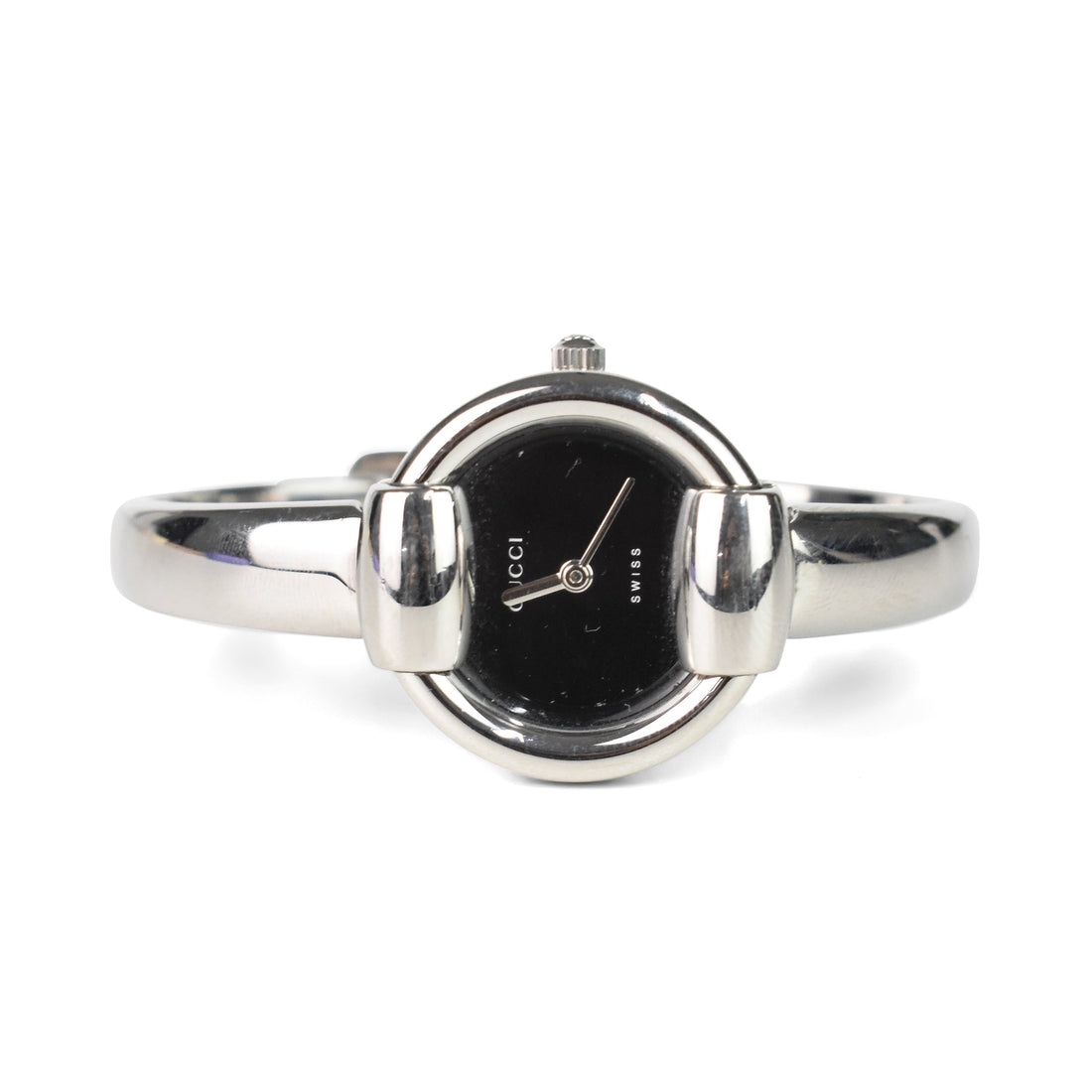 Gucci Vintage Watch with a round black face, silver dial and a horse-bit detail band....