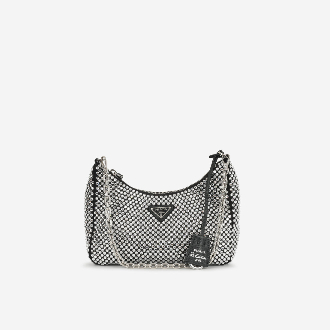 Carefully crafted with black satin fabric adorned with crystals, the shoulder bag is one of...