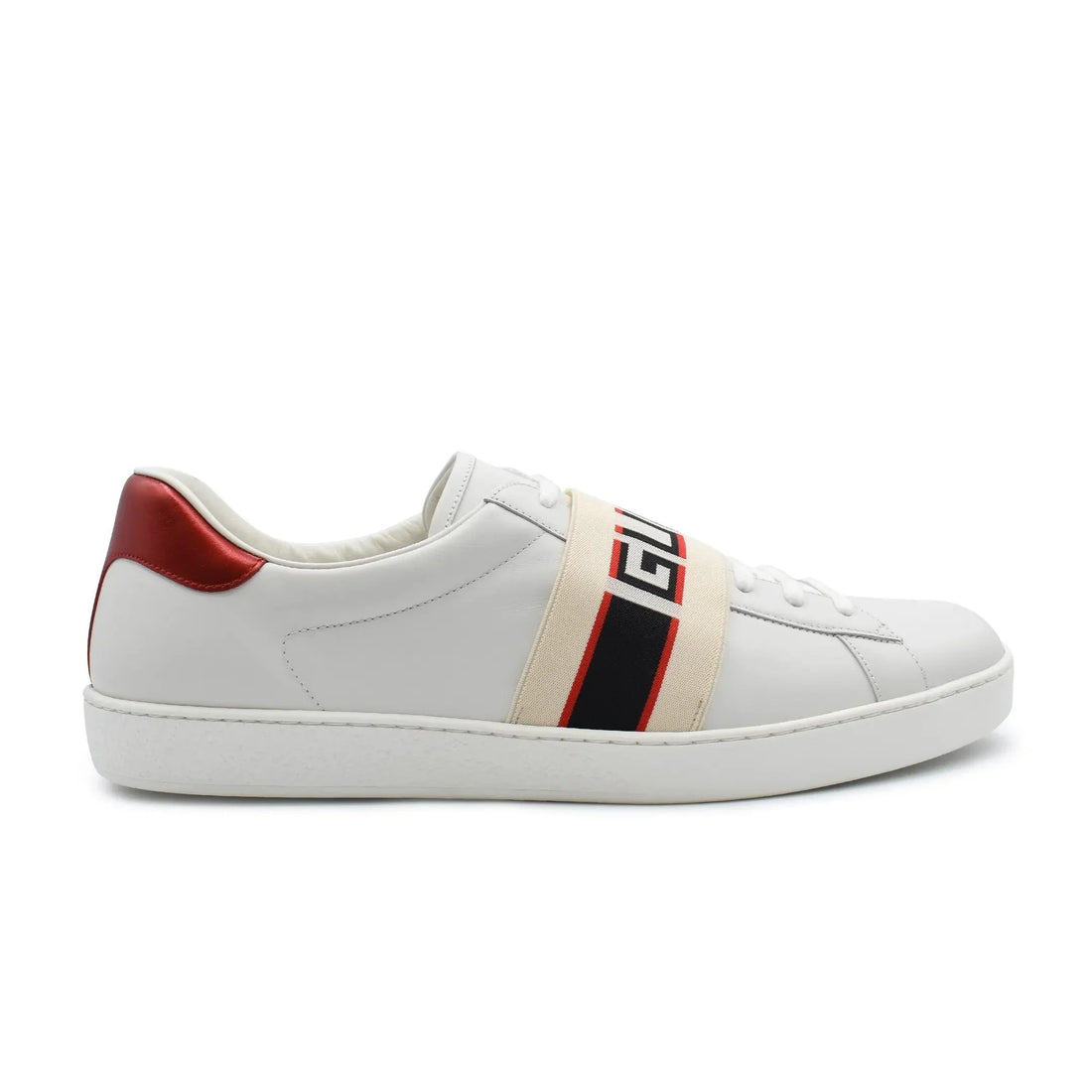 Gucci 'Ace' low top sneakers in white leather with racing stripe webbing, snakeskin heels, and...