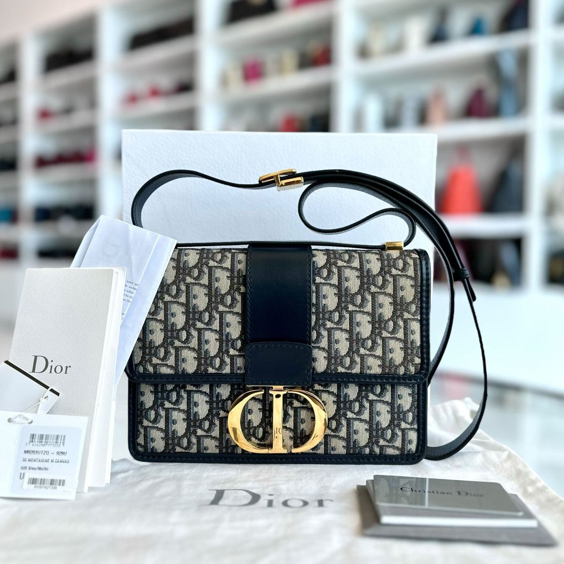 *Full Set, Receipt* Montaigne 30 Oblique Canvas Blue Shoulder Bag GHW