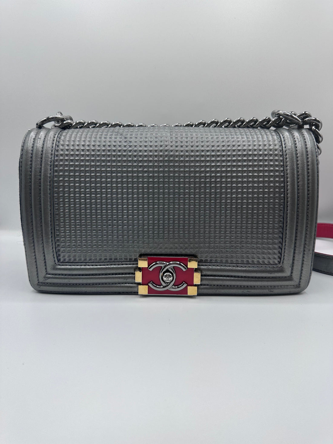 Chanel Boy Grey leather Crossbody Bag Medium with Red leather details, and silver hardware. As...