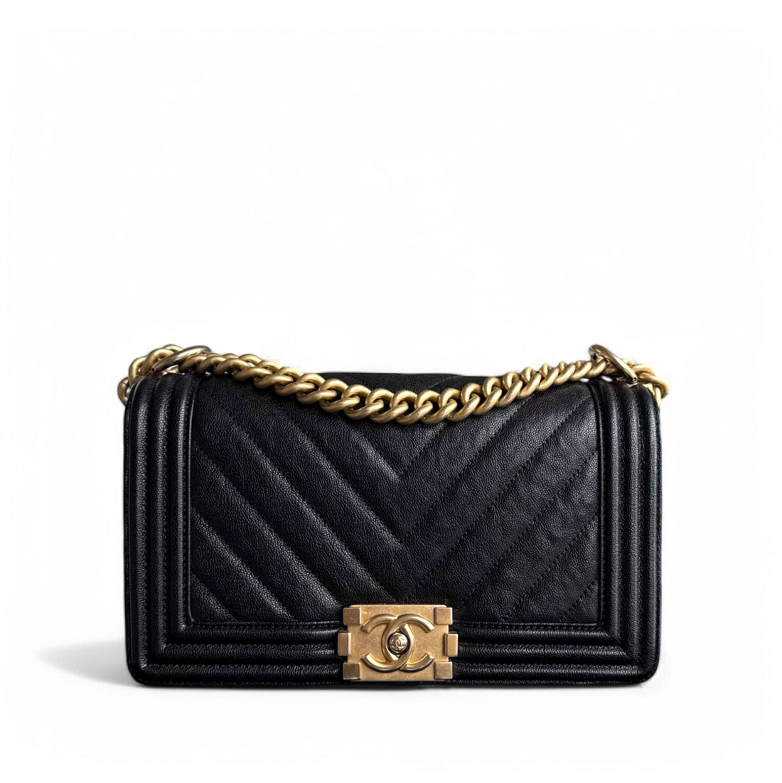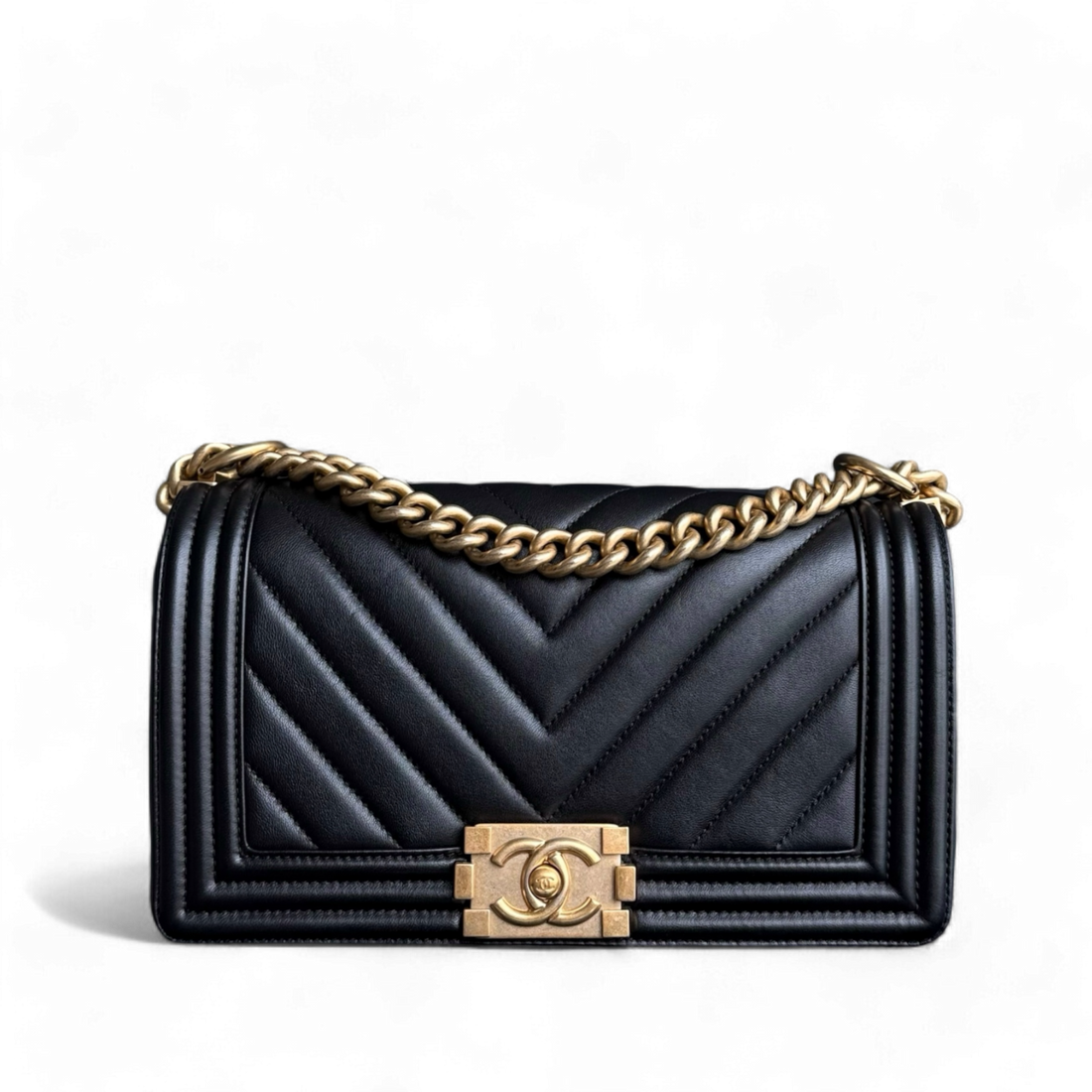 Chanel Boy Medium - Calfskin 25CM Chevron Black Gold Hardware Series 24