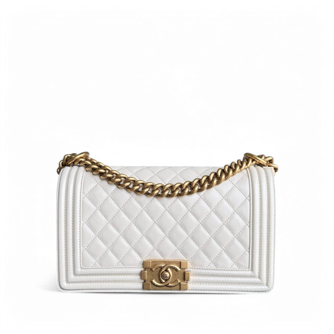 Chanel Boy Medium - Caivar 25CM Quilted Cream White Shiny Gold Hardware Series 28
