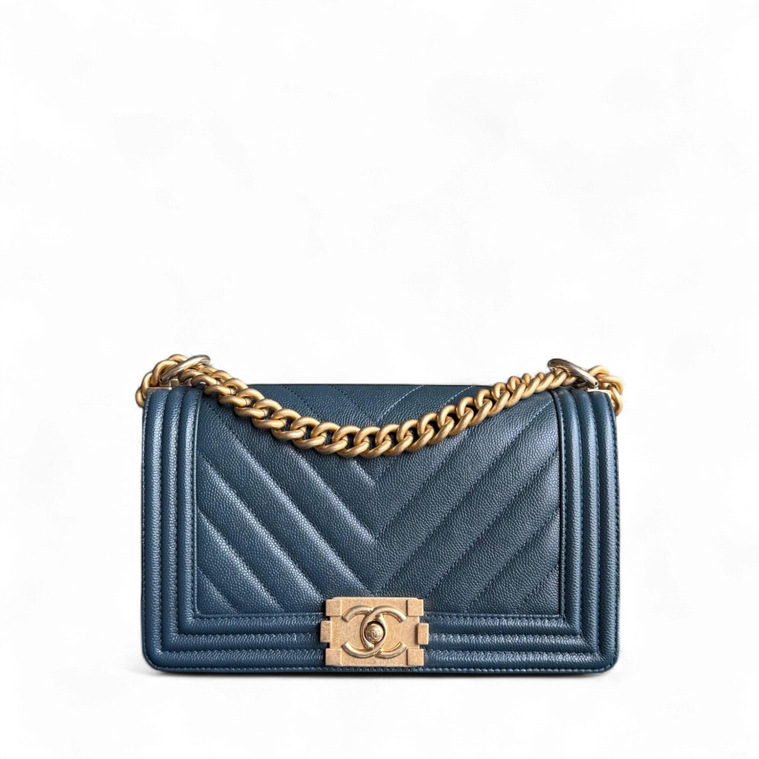 Chanel Boy Medium - Caviar 25CM Chevron Grained Calfskin Blue Gold Hardware Series 25