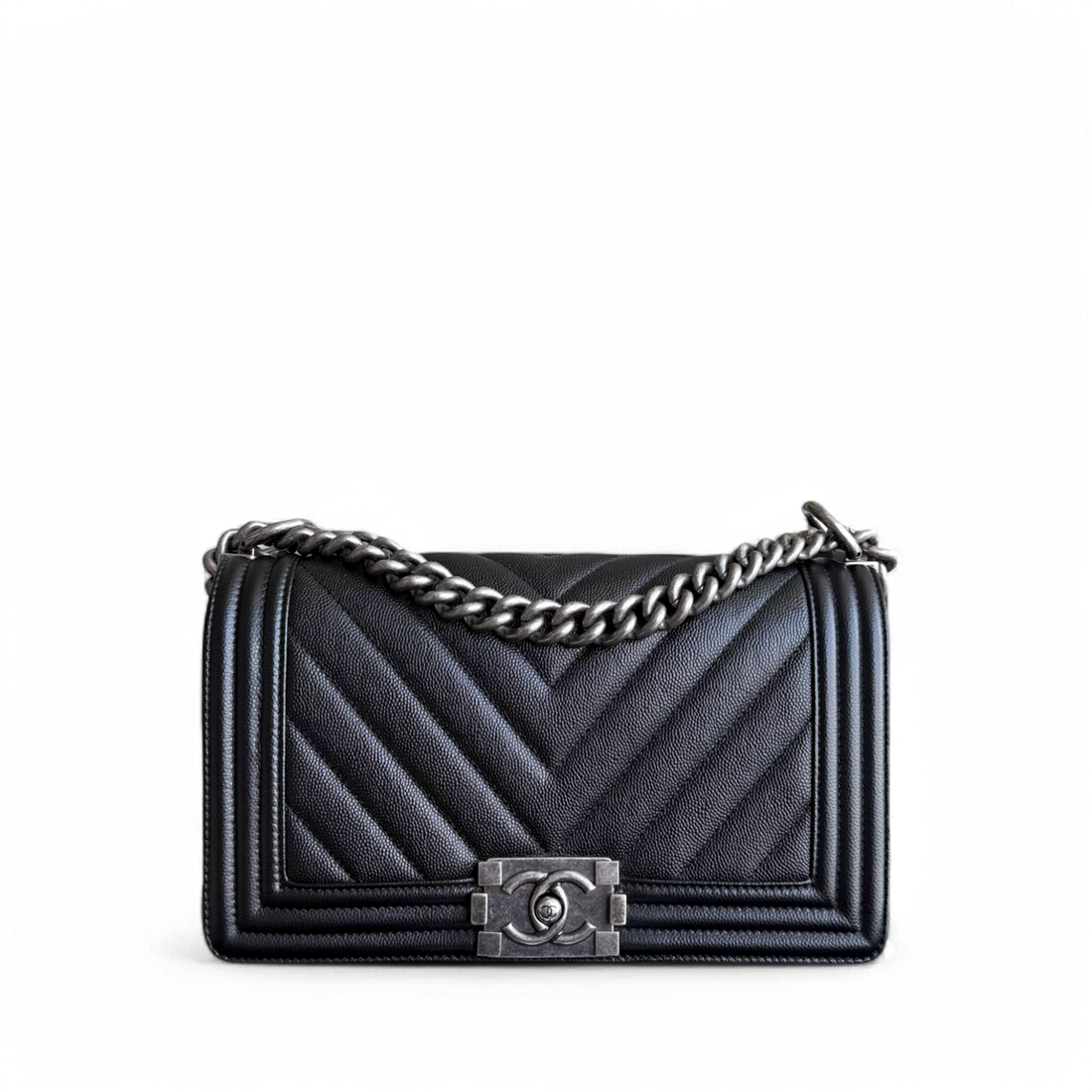 Chanel Boy Medium - Caviar 25CM Chevron Black Ruthenium Silver Hardware Series 24