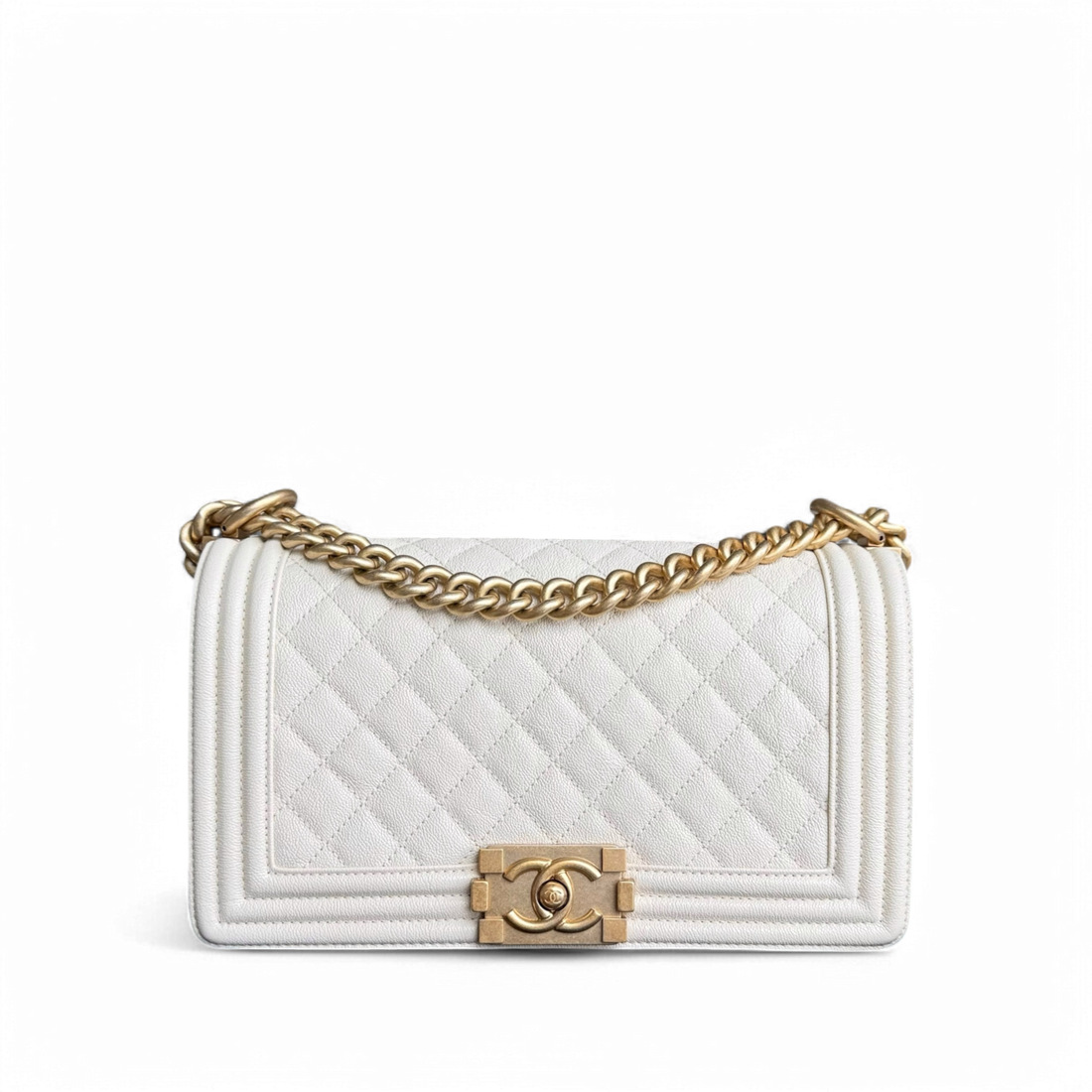 Chanel Boy Medium - Caviar 25CM Cream White Aged Gold Hardware Series 26
