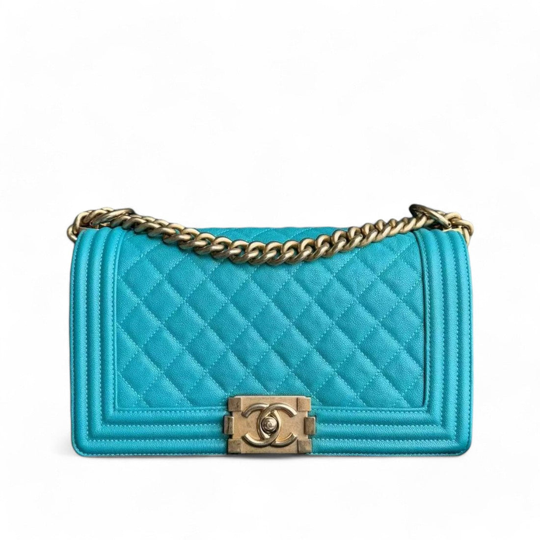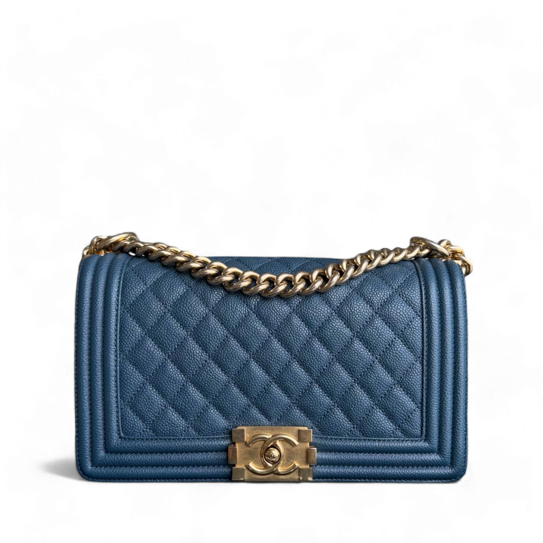 Overview Chanel Boy Medium in stunning quilted blue caviar leather, paired with elegant golden hardware....