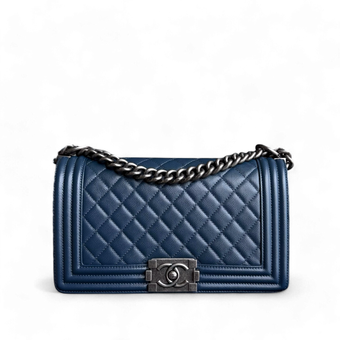 Chanel Boy Medium - Caviar 25CM Quilted Dark Blue Ruthenium Gold Hardware Series 19