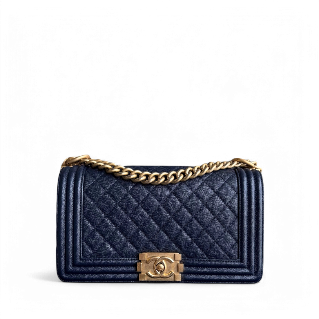 Chanel Boy Medium - Caviar 25CM Quilted Dark Blue Gold Hardware Series 25