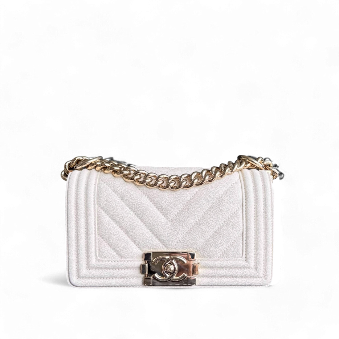 Chanel Boy Small - Caviar 20CM Chevron Cream White Gold Hardware Series 29