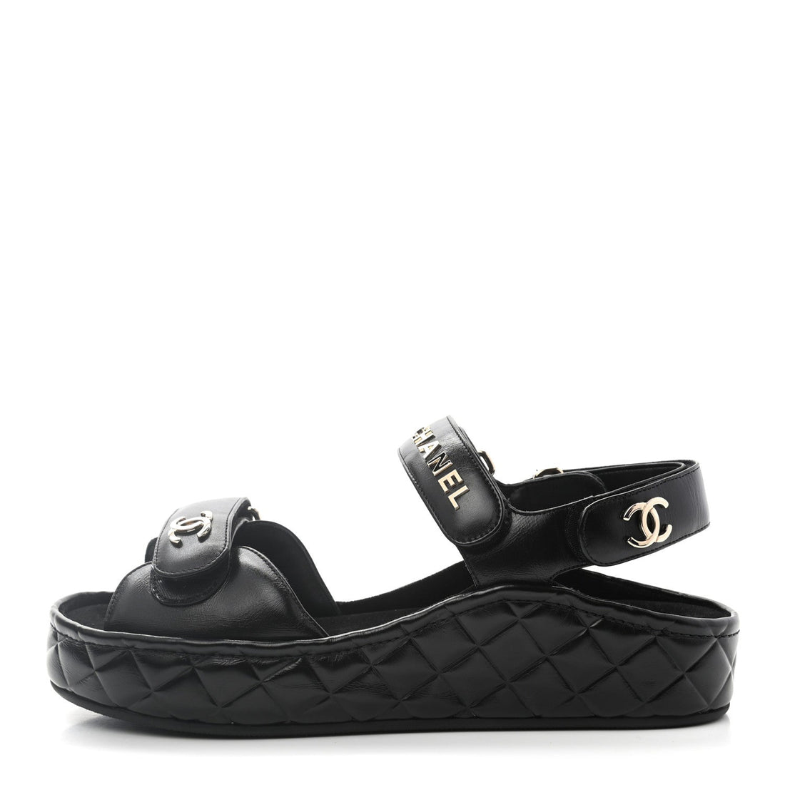CHANEL Calfskin Logo Platform SandalsNEW Condition With Box. Crafted of black shiny calfskin leather. These...