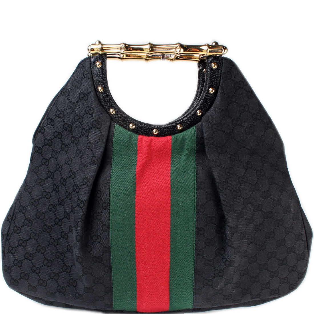 This Gucci GG Canvas Metal Bamboois eye catching bag. The exterior is in the classic Gucci...