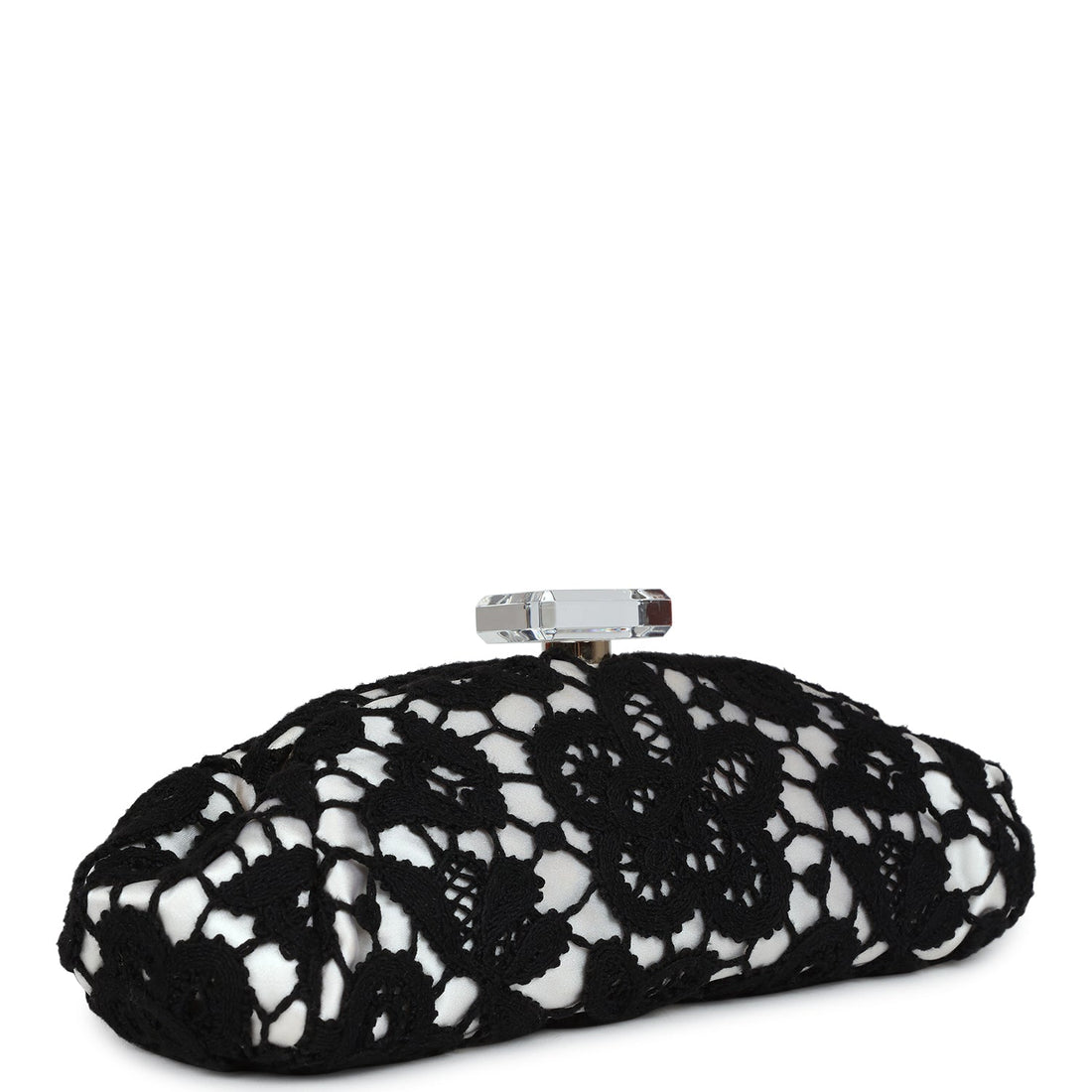 This clutch is in Black lace and White satin with gold hardware, featuring a black lace overlay, gold-tone...