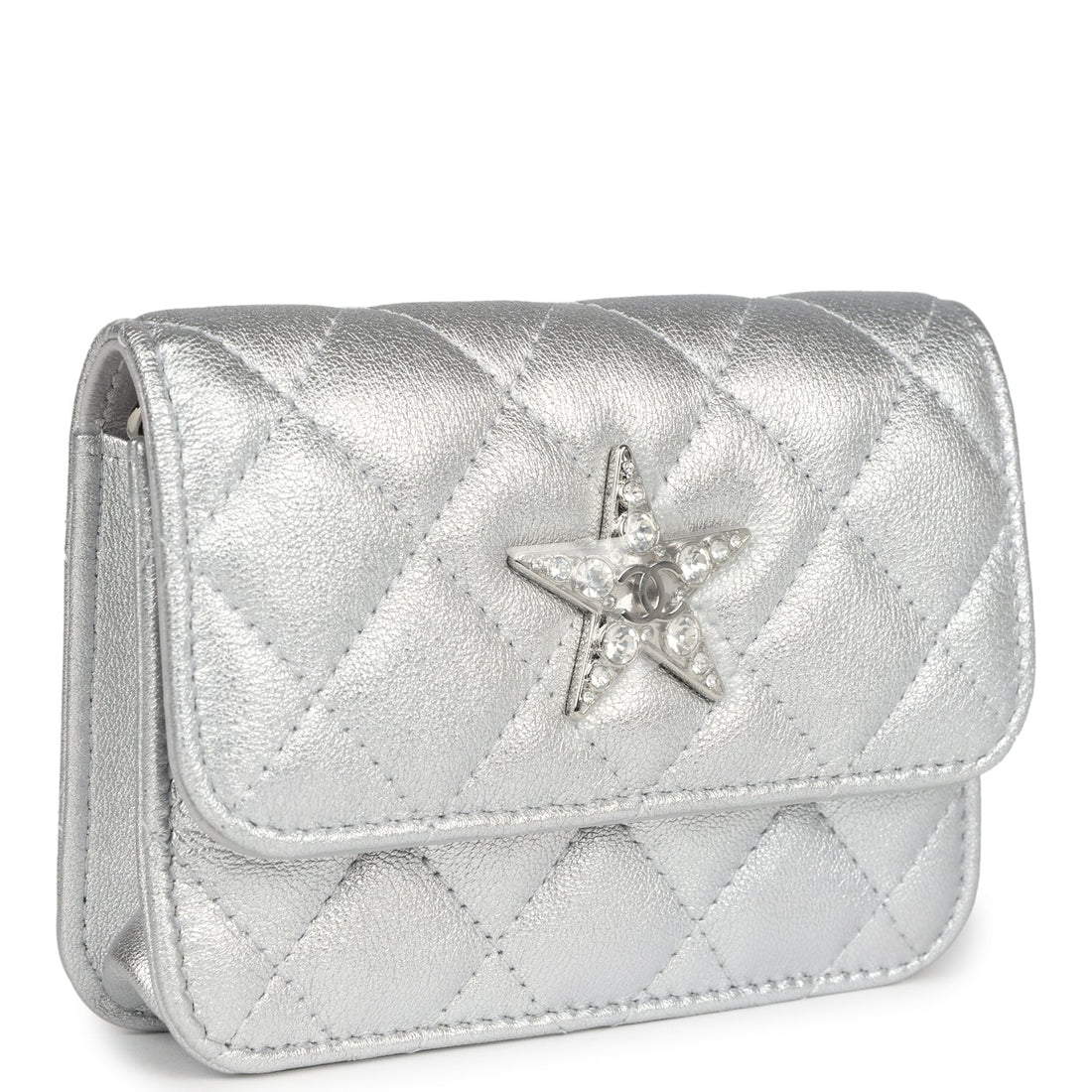 Chanel Crystal CC Walk Of Fame Clutch Wallet Silver Metallic Goatskin Silver Hardware
