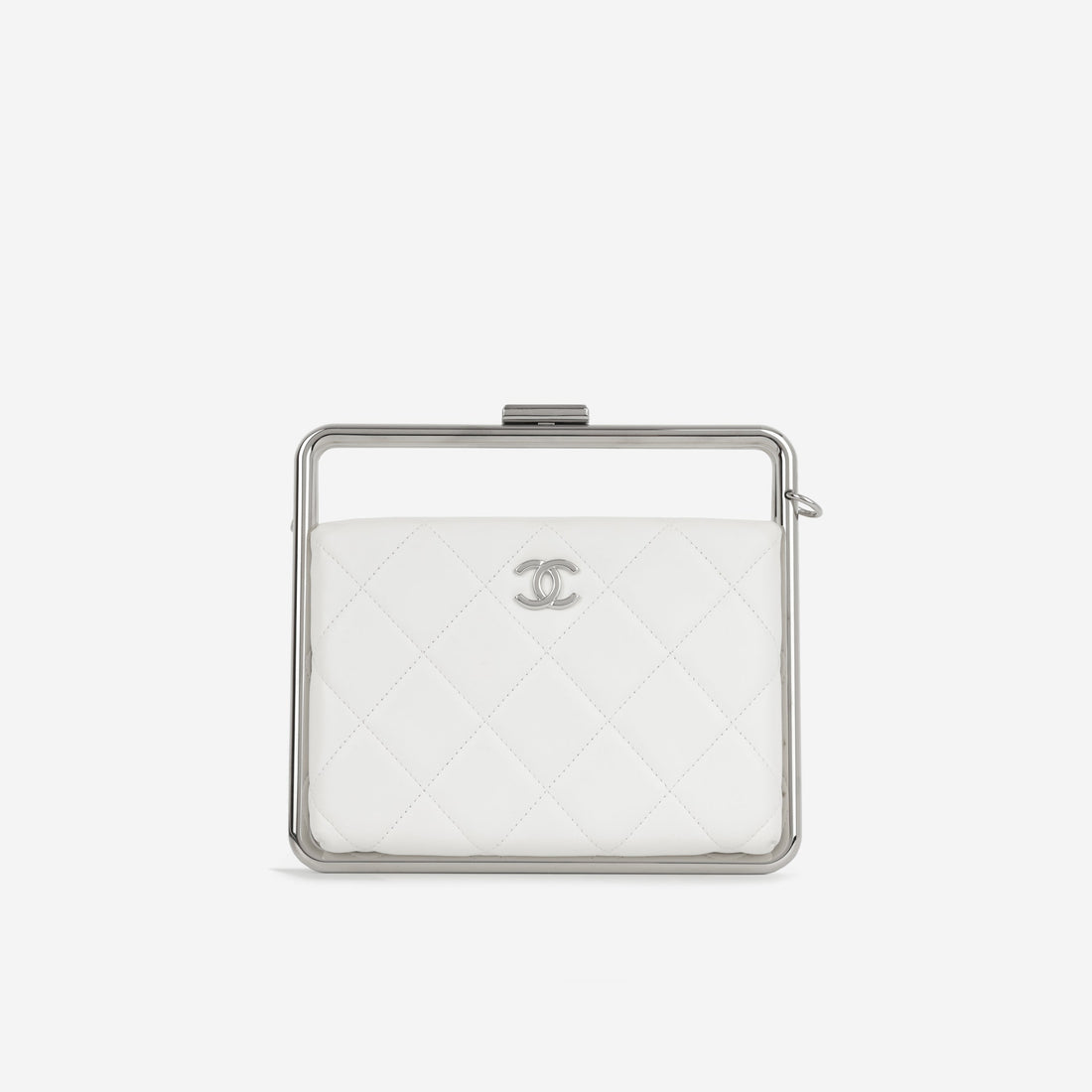 Sleek, modern, and unmistakably Chanel, the Convertible Clutch Satchel in white lambskin leather with silver...