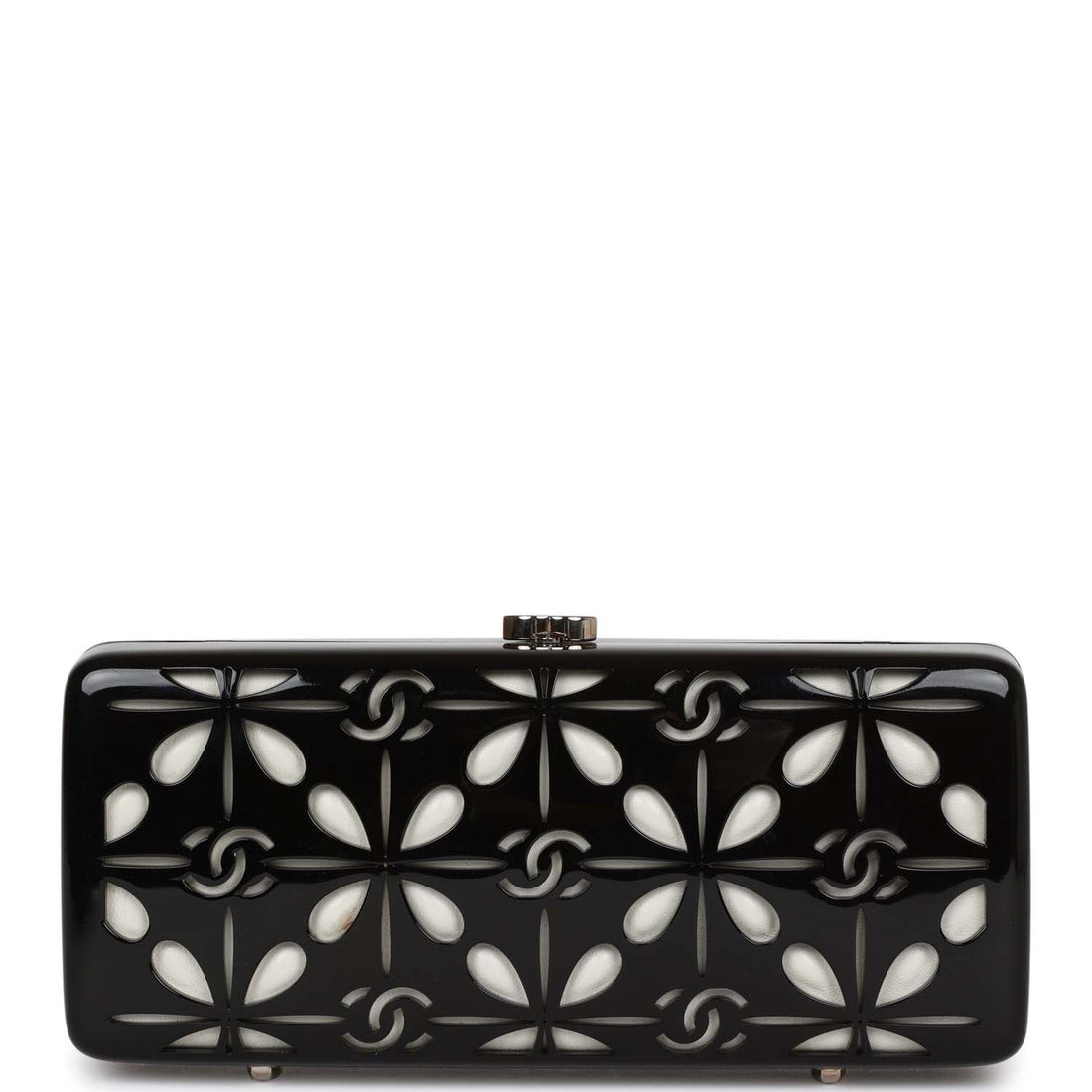 This Minaudiere clutch is of Black acrylic and White leather with silver hardware, top CC snap closure,...