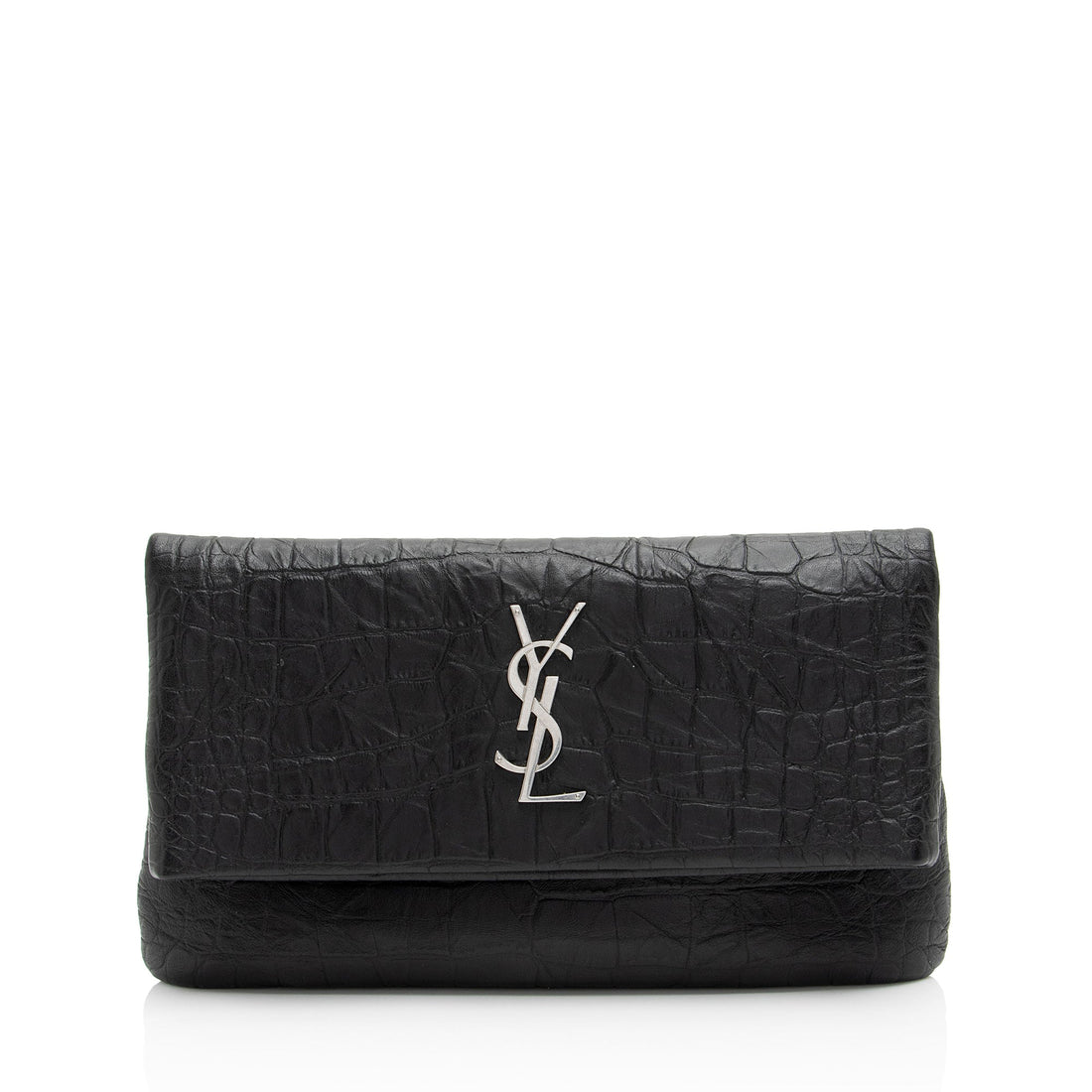 Saint Laurent Croc Embossed Leather West Hollywood Fold Over Clutch (SHF-NOzA7P)