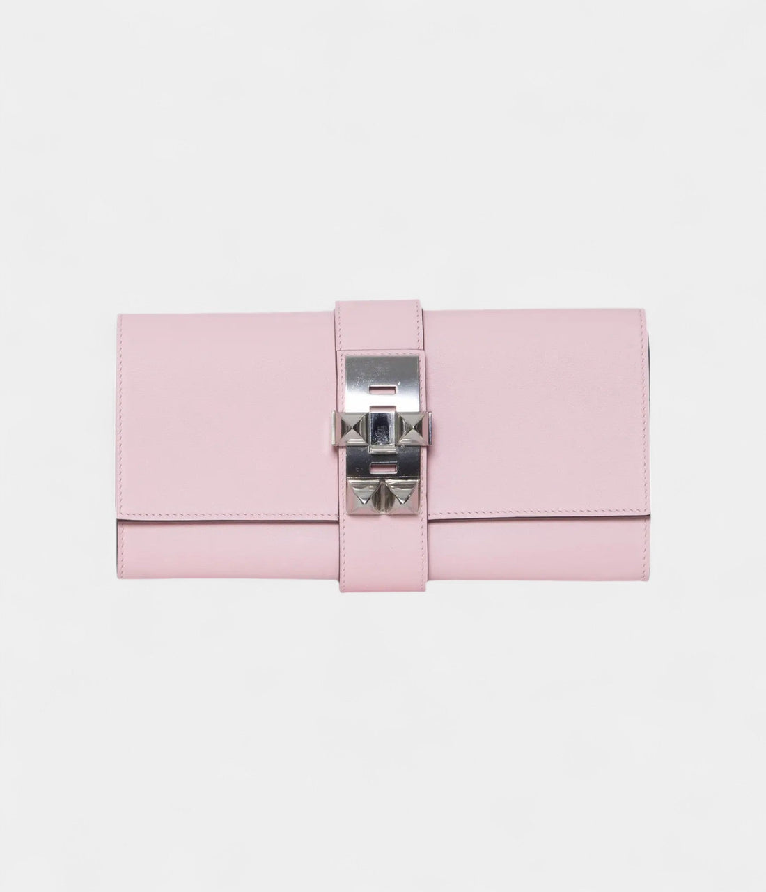 The Hermès Médor Clutch in pink leather is a striking fusion of minimalist design and...