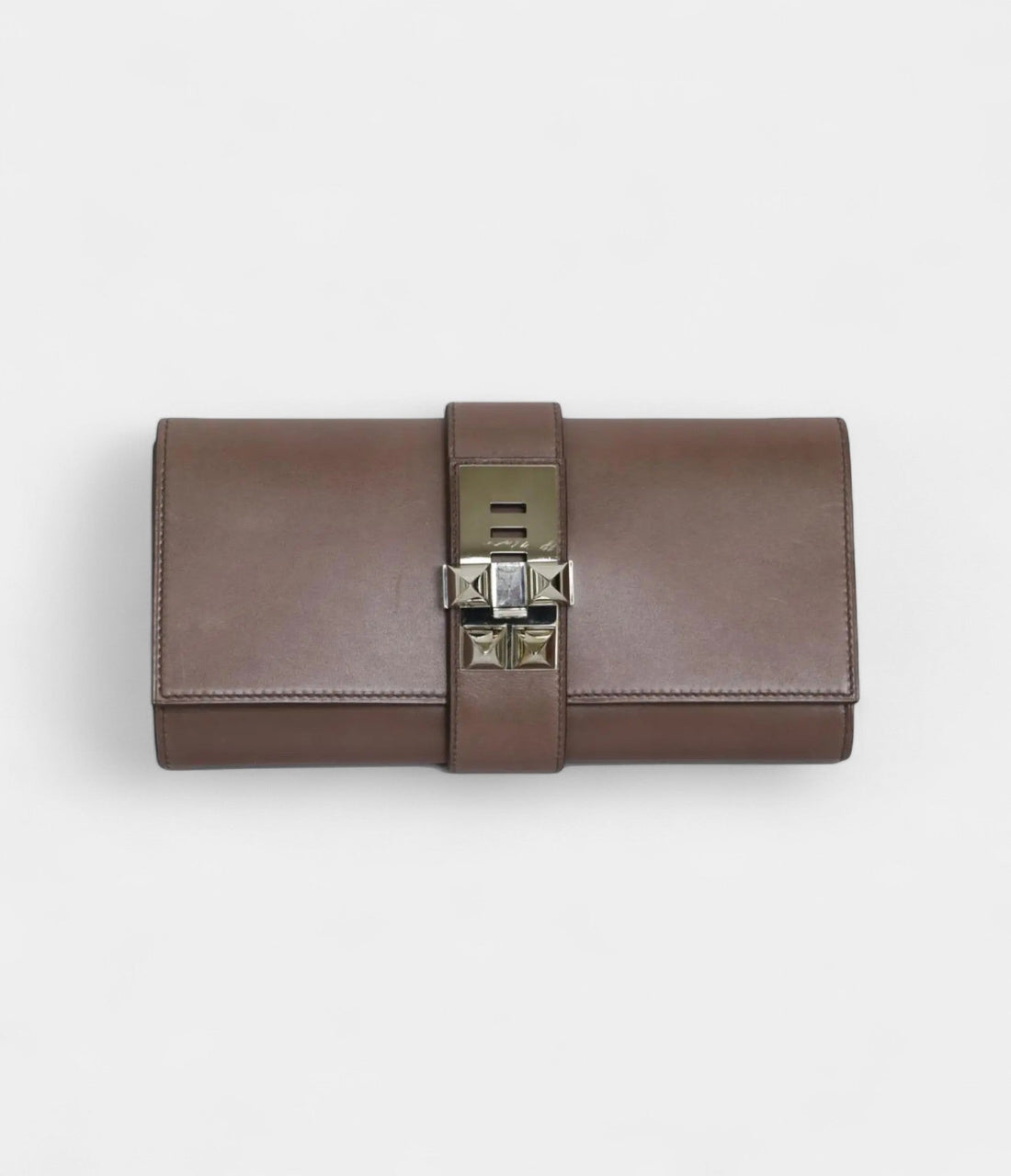 The Hermès Médor Clutch in grey leather is a refined embodiment of minimalist elegance, accentuated...