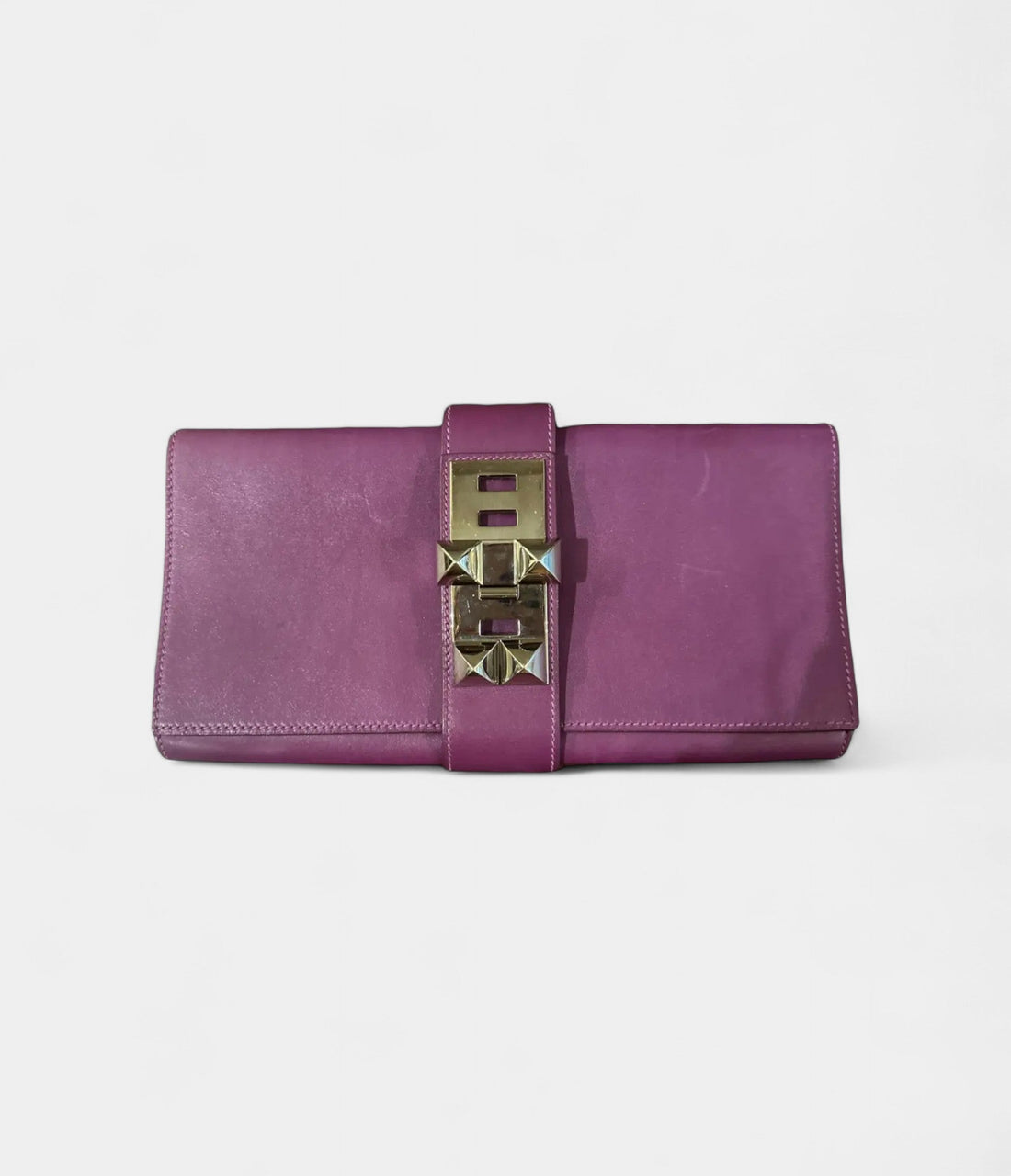The Hermès Médor 23 Clutch in purple leather is a striking fusion of minimalist design...